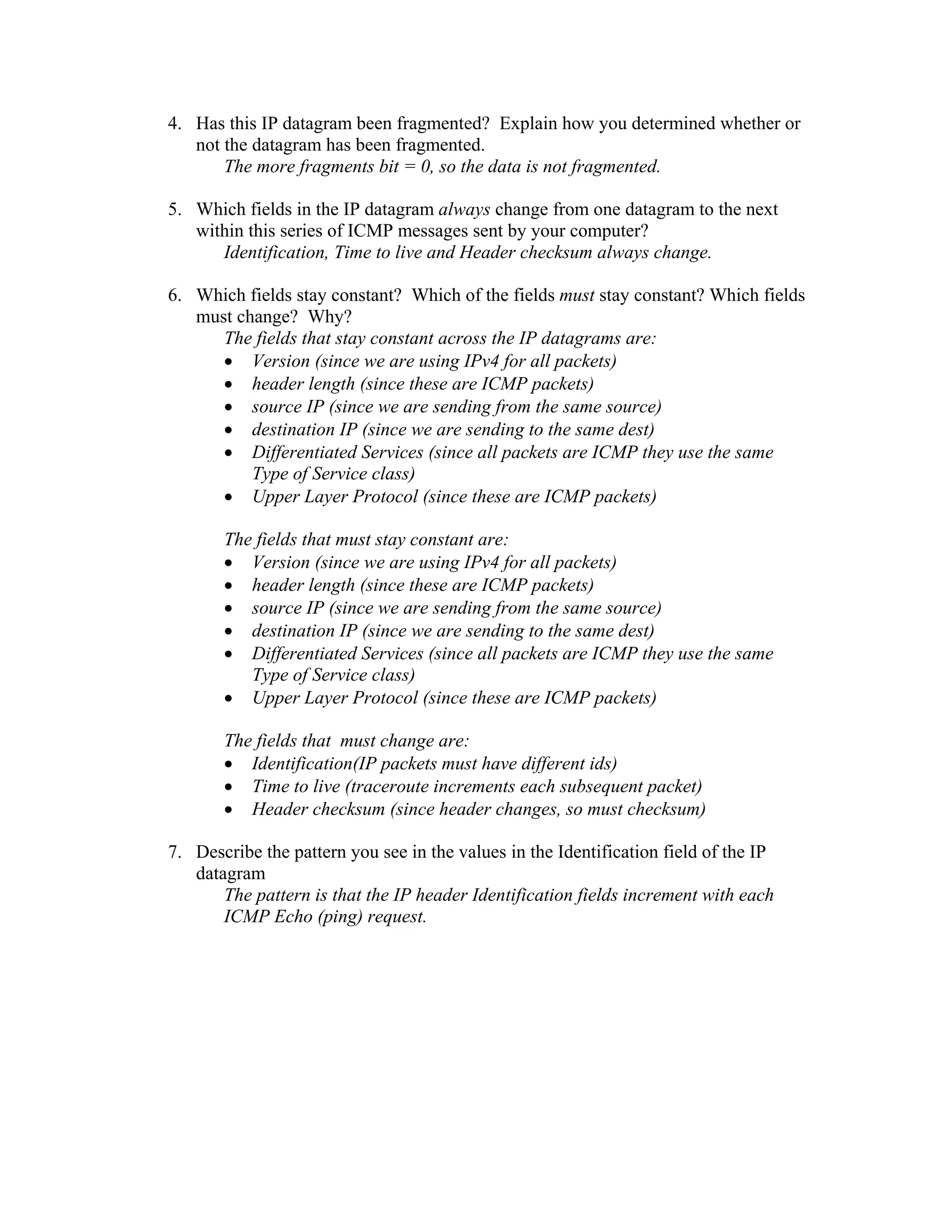 This document summarizes the results of a Wireshark lab examining IP packet headers for ICMP echo requests and replies. It finds that the IP identification, TTL, and checksum fields change between packets, while other fields like source/destination IP and protocol stay constant. When packet fragmentation occurs, the fragment offset and checksum change between fragments, while total length and flags indicate if it is the first/last fragment.