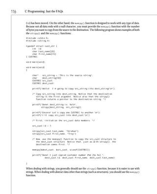 This chapter discusses various string manipulation techniques in C, including copying strings, comparing strings, removing trailing/leading spaces, padding strings, and copying portions of strings. The standard C library provides functions like strcpy(), strcmp(), rtrim(), printf(), and memcpy() that are useful for string manipulation tasks. Examples are provided to demonstrate how to implement string operations like removing spaces, justifying text, and copying substrings.