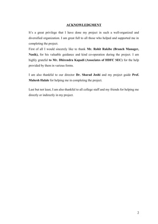 The document is a project report submitted to HDFC Securities by a student as part of an MBA program. It discusses risk management in stock broking firms and their impact on investors. The report begins with an acknowledgment section thanking those who helped with the project. It then covers various topics through different chapters - an executive summary, company profile of HDFC Securities, objectives of the project, research methodology, data presentation on capital markets and how broking firms work, data analysis and interpretation of risk management in broking firms, and conclusion with recommendations.
