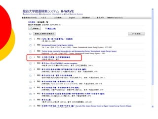 - #6 データベースを使い分けようと言うことで、実習して頂く前に、どの資料を探すときにどんなデータベースを使えば良いのか先にご紹介しておきます。 まずは、龍谷大学内の資料を探したいとき、R-WAVE 次に最近流行の電子書籍、NetLibrary(但し、龍大購入分のみ) 最後に専門分野についてJ-STAGE 理科年表といった理系に枠立つもの この4点を中心に使い方の説明をしていきます。