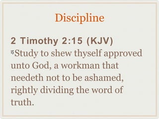 This document lists 10 Bible verses that are recommended for teens to know. It includes verses about discipline, purpose, obedience, humility, leadership, purity, righteousness, submission, perseverance, and God's promise of eternal life through belief in Jesus Christ. The verses provide guidance for teens on studying Scripture, trusting God's plans, honoring parents, being humble, leading by example, glorifying God with their bodies, fleeing lusts, submitting to God, fighting the good fight of faith, and believing in Jesus for salvation.