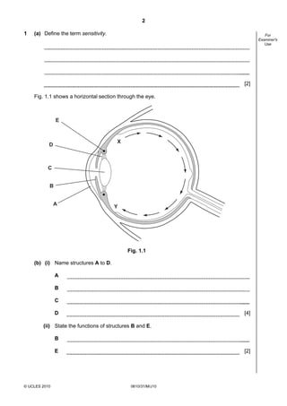 This document is an exam paper for the International General Certificate of Secondary Education (IGCSE) Biology exam. It consists of several multiple choice and written response questions covering topics in biology like the structure and function of the eye, plant respiration, tomato plant growth in glasshouses vs open fields, human reproduction, acid rain, yoghurt production, food shortages, and selective breeding. Students are asked to define terms, describe processes, interpret graphs and diagrams, calculate percentages, and suggest explanations.
