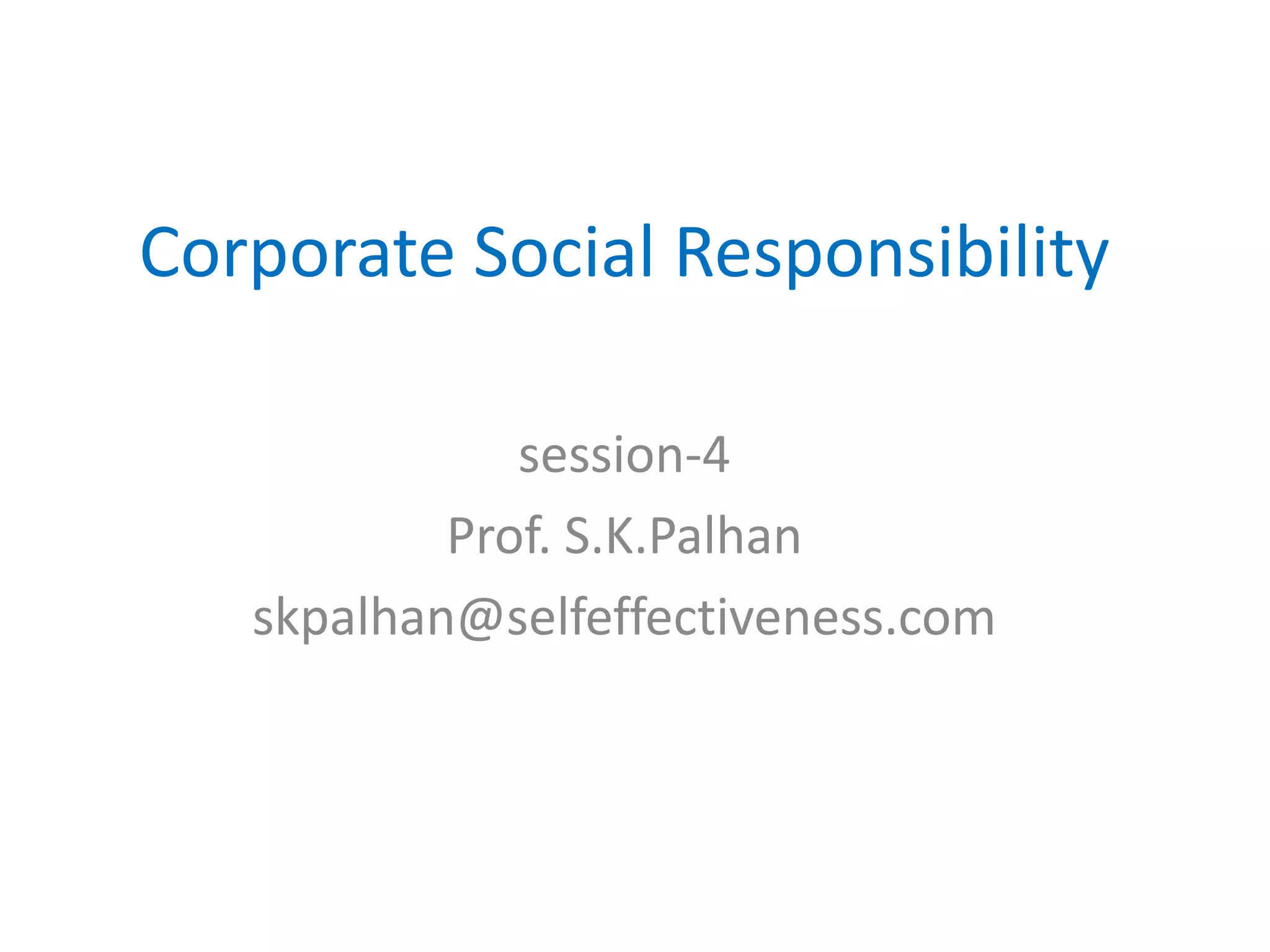 This document discusses the history and concepts of corporate social responsibility. It describes how views of CSR have evolved from a focus on profits alone to recognizing corporations' responsibilities to society. CSR involves companies voluntarily addressing ethical and social issues and stakeholders' needs. The document outlines the advantages of CSR and provides examples of CSR standards, awards, and initiatives in India.