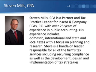The document provides an overview of the 4th annual tax update featuring presenters Steven Mills, Don Susswein, and Mark Peterson, discussing individual tax brackets, alternative minimum tax exemptions, dividend rates, and other significant tax issues as of January 1, 2013. It also includes recommendations for tax planning amidst the evolving tax landscape, emphasizing the importance of being proactive in managing tax liabilities and understanding the implications of the Affordable Care Act. The document concludes with various observations about tax reform and its historical context.