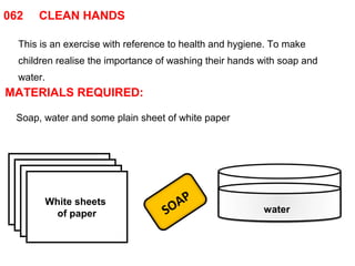 This document describes an exercise to teach children the importance of washing their hands with soap and water. The exercise involves having children place their hands on paper after washing with just water or soap and water, so they can see the difference - hands washed with just water will leave dirty marks while soap and water will leave clean hands and clean paper. The goal is to help children understand good hygiene practices through a hands-on demonstration.