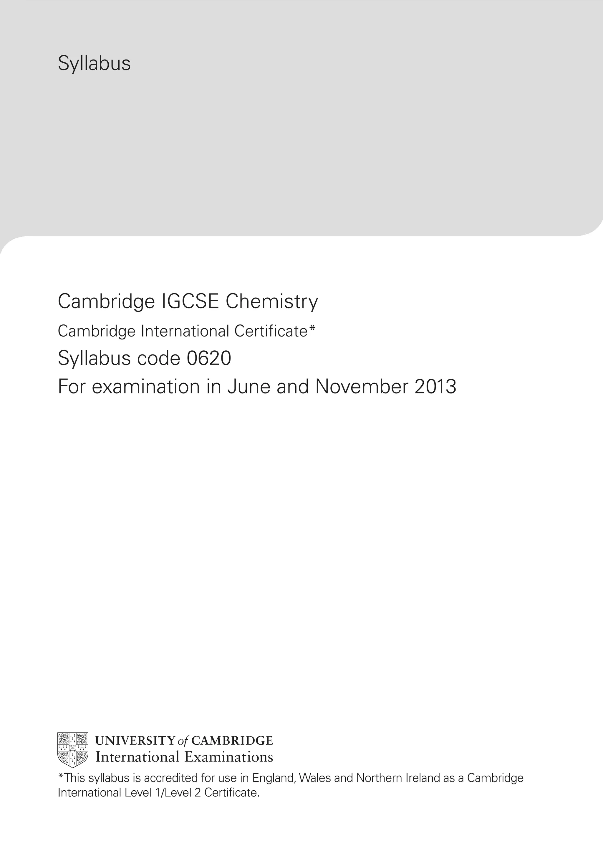 This document is the syllabus for Cambridge IGCSE Chemistry. It outlines the aims, assessment methods, curriculum content, and practical assessment requirements for the qualification. The syllabus aims to provide students with knowledge and understanding of chemistry principles and develop skills relevant to further study and everyday life. Students are assessed through multiple choice, short answer, and structured questions across three exam papers, and they conduct practical/investigative work that is assessed through a fourth paper or an alternative paper. The syllabus also includes appendices with additional information, guidelines, and forms.
