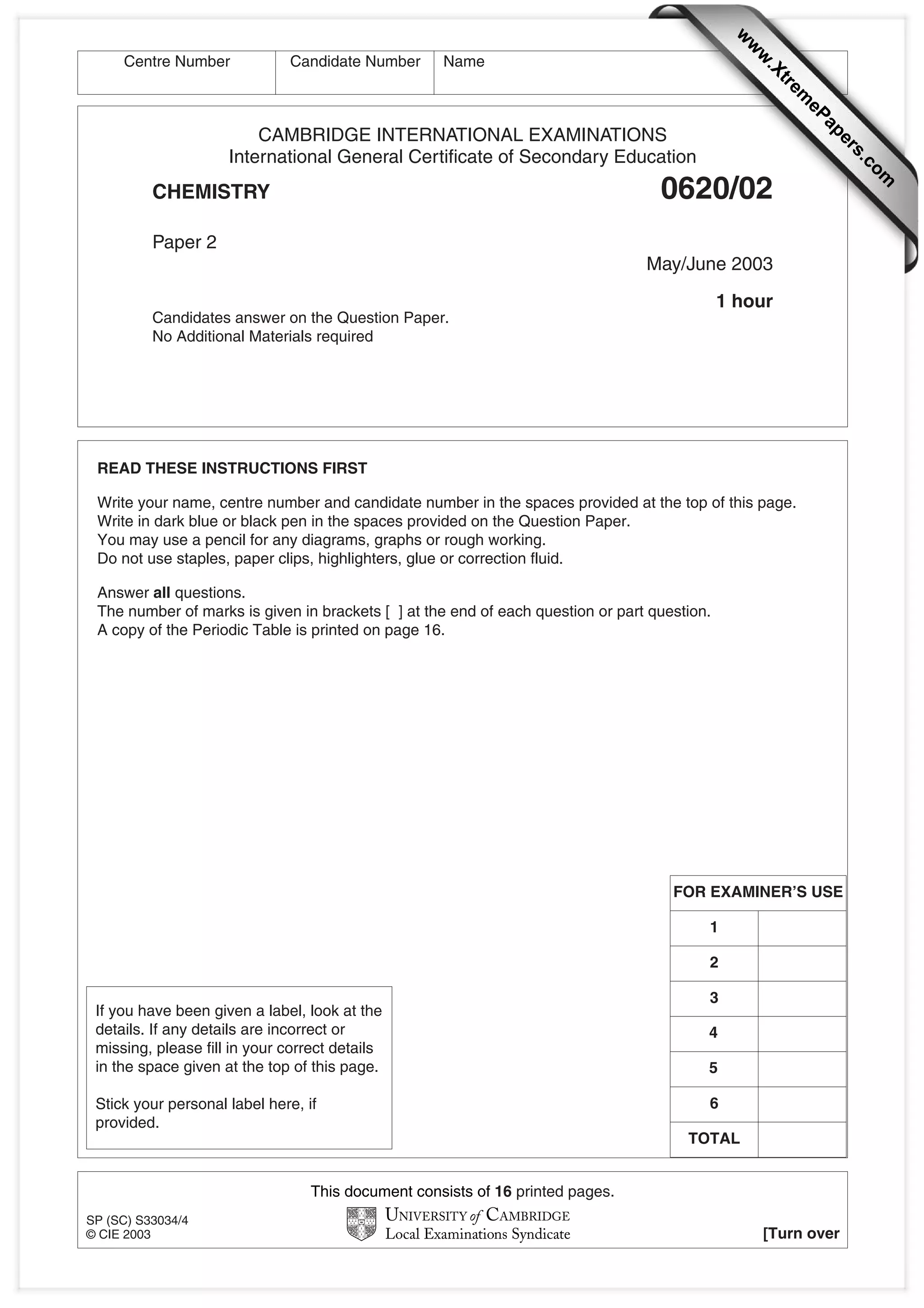 This document appears to be an exam paper for chemistry. It consists of multiple choice and short answer questions testing knowledge of chemistry concepts including the periodic table, chemical reactions, states of matter, and experimental procedures. The questions cover topics such as identifying elements on the periodic table, writing balanced chemical equations, describing phase changes and molecular motion, naming compounds, and explaining laboratory techniques.