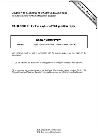 This document contains the mark scheme for the May/June 2008 International General Certificate of Secondary Education (IGCSE) Chemistry exam. It lists the questions from the multiple choice exam paper and provides the key or correct answer for each question. There are 40 questions total and the correct answers are identified by letters A-D. The mark scheme is published by the University of Cambridge International Examinations to aid in evaluating student responses on the multiple choice exam.