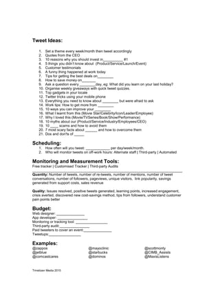 The document outlines objectives and a strategy for a Twitter channel called Trinetizen Media 2015. It includes 12 objectives to be achieved by December 1, 2015 related to metrics like tweets, followers, engagement. It also covers the type of channel, tweet ideas, scheduling, monitoring tools, budget examples and key performance indicators to track success.