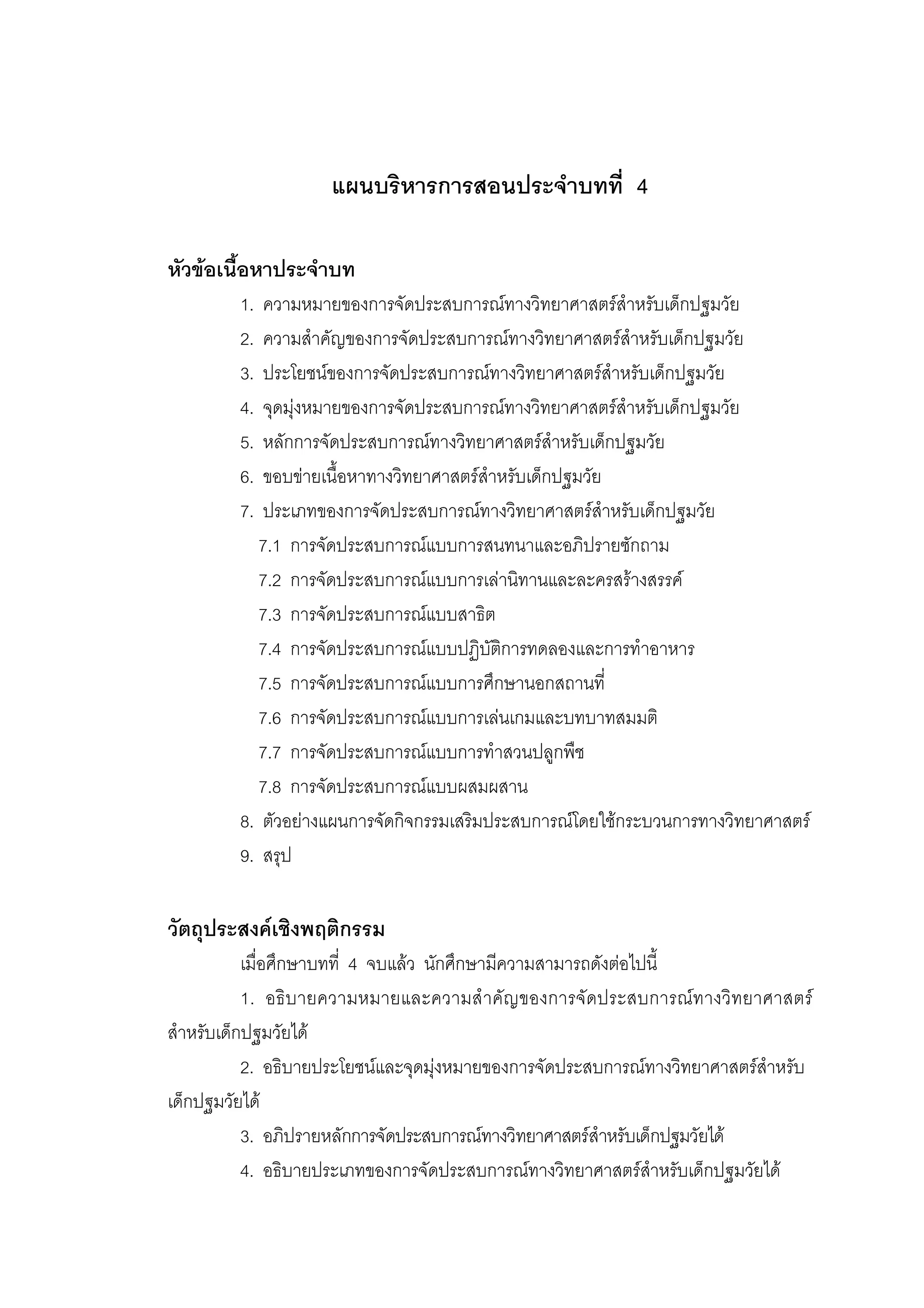บทที่ 4 การจัดประสบการณทางวิทยาศาสตรสําหรับเด็กปฐมวัย เด็กปฐมวัยเปนวัยที่มีการพัฒนาทุก ๆ ดานเปนไปอยางรวดเร็ว เด็กจะพัฒนาความ เปนตัวของตัวเอง เรียนรูจากการเลียนแบบ กระตือรือรน อยากเรียนอยากรูทุก ๆ เรื่องที่สนใจ รวมถึงสิ่งแปลกใหมรอบตัว การจัดประสบการณเพื่อสงเสริมพัฒนาการดานตาง ๆ ใหกับเด็กวัยนี้ โดยผ า นทางกิ จ กรรมที่ จั ด เตรีย มไว จึ ง เป น สิ่ง สํ า คัญ เพื่ อ ให เ ด็ ก ไดรู จั ก การปรั บ ตั ว ให เ ข า กั บ สภาพแวดลอมและสังคม เปนการปูพื้นฐานเพื่อการพัฒนาคุณภาพชีวิตที่ดี ใหเด็กมีความพรอม ในการแกปญหาตาง ๆ ดวยความเขาใจและมีเหตุผล โดยคํานึงถึงบริบททางสังคมที่แวดลอมเด็ก ํ การจัดประสบการณสําหรับเด็กปฐมวัยจึงเปนหัวใจสาคัญในการจัดการศึกษาปฐมวัย ครูควร คํานึงถึงความพรอม ความสนใจ และความตองการตามวัยของเด็ก เมื่อครูเขาใจความตองการ เหล า นี้ ข องเด็ ก แล ว ช ว ยให ค รู มี ค วามสามารถจั ด ประสบการณ เ พื่ อ พั ฒ นาเด็ ก ได ต าม จุดมุงหมาย โดยเฉพาะการจัดประสบการณทางวิทยาศาสตร เนื่องจากเด็กจะมีโอกาสไดใช ประสาทสัมผัสทั้งหา พรอมทั้งการไดเคลื่อนไหวสวนตาง ๆ ของรางกายจากการทํากิจกรรมที่ครูจัด ประสบการณให ครูควรมีความรู ความเขา ใจ เกี่ยวกับขั้นตอนและวิธีการจัดประสบการณ ที่ถูกตองเหมาะสม เพื่อพัฒนาเด็กใหสอดคลองกับธรรมชาติตามวัยและเพื่อเปนการปลูกฝง เจตคติที่ดีทางวิทยาศาสตรสําหรับการเรียนวิทยาศาสตรในขั้นสูงตอไป ความหมายของการจัดประสบการณทางวิทยาศาสตรสําหรับเด็กปฐมวัย การจั ดประสบการณ ทางวิ ทยาศาสตร สํ าหรั บเด็กปฐมวั ย ผู มี บทบาทสํ าคั ญก็ คื อครู โดยครู ควรเป นผูที่ มี ความรู ความเขาใจ และมีความสามารถในการจัดประสบการณดั งกลาวให เหมาะสมสําหรับเด็กแตละคนในชั้นเปนอยางดี ชวยสรางประสบการณที่มีความหมายและมีคุณคา ใหกับเด็ก การจัดประสบการณทางวิทยาศาสตรก็จะประสบความสําเร็จ ครูจึงควรทราบความหมาย ของการจัดประสบการณ เพื่อสรางความเขาใจที่ตรงกันวาจะจัดเพื่ออะไร ไดมีนักการศึกษาหลายทาน ใหความหมายของการจัดประสบการณทางวิทยาศาสตรสําหรับเด็กปฐมวัยไวนาสนใจซึ่งจะกลาวถึง ตอไปนี้ ภรณี คุรุรัตนะ (2540, หนา 49) กลาววา ประสบการณมีความหมายครอบคลุมกิจกรรม ตาง ๆ ที่เกิดขึ้นโดยจะสรางขึ้นเองโดยเจตนาหรือไมเจตนาก็ได แตผูไดรับประสบการณก็คือเด็ก ไดมีการเรียนรูและสะสมความรู ความสามารถ และความรูสึกตาง ๆ ไว