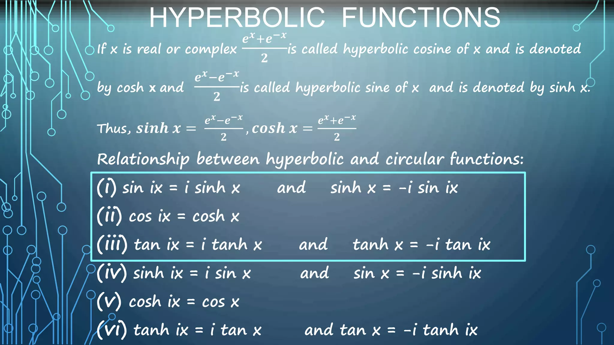 The document discusses hyperbolic functions and their properties. It defines hyperbolic cosine and sine as cosh x = (ex + e-x)/2 and sinh x = (ex - e-x)/2. Some key relationships between hyperbolic and circular functions are given. Formulas for hyperbolic functions of 2x and 3x are provided. The document also discusses differentiation and integration of hyperbolic functions, product formulas, inverse hyperbolic functions, and integration formulas involving hyperbolic functions.