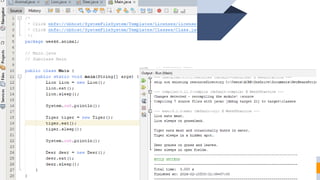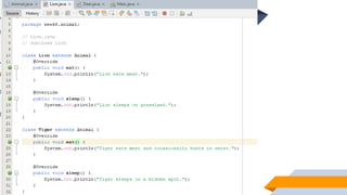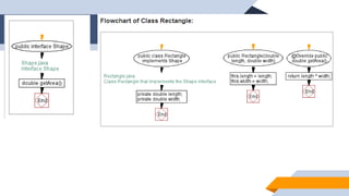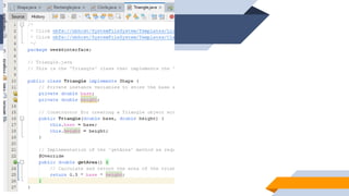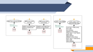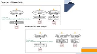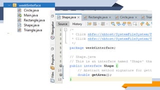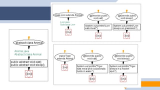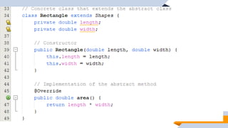 1. The document discusses abstraction, abstract classes, and interfaces in object-oriented programming and Java. It provides examples of declaring abstract classes with abstract methods and subclasses implementing those methods. 2. It also discusses interfaces and how classes can implement interfaces by providing implementations for the interface's abstract methods. 3. The examples create abstract classes like Animal and Shape3D and interfaces like Shape. Subclasses and classes that implement the interfaces override the abstract methods to provide class-specific behavior.