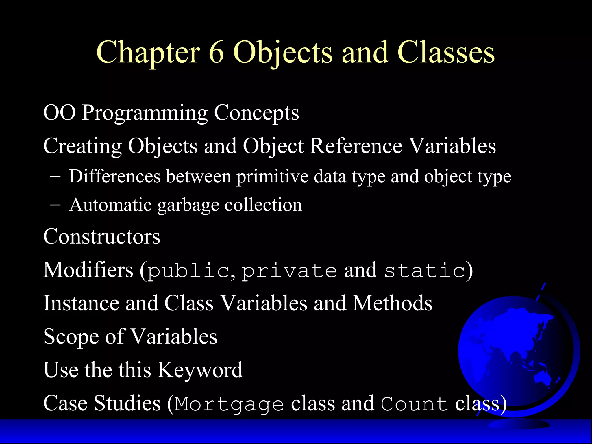 This document summarizes key concepts from Chapter 6 on objects and classes in object-oriented programming. It discusses creating objects and object reference variables, differences between primitive and object types, constructors, modifiers like public and private, instance and class variables/methods, scope of variables, using the this keyword, and case studies on the Mortgage and Count classes. Examples are provided to demonstrate concepts like creating objects, accessing data/methods, using constructors, private modifiers and accessor methods, passing objects to methods, instance vs class variables/methods, scope, and arrays of objects. Core Java packages like java.lang, java.awt, java.io, and java.util are also briefly described.