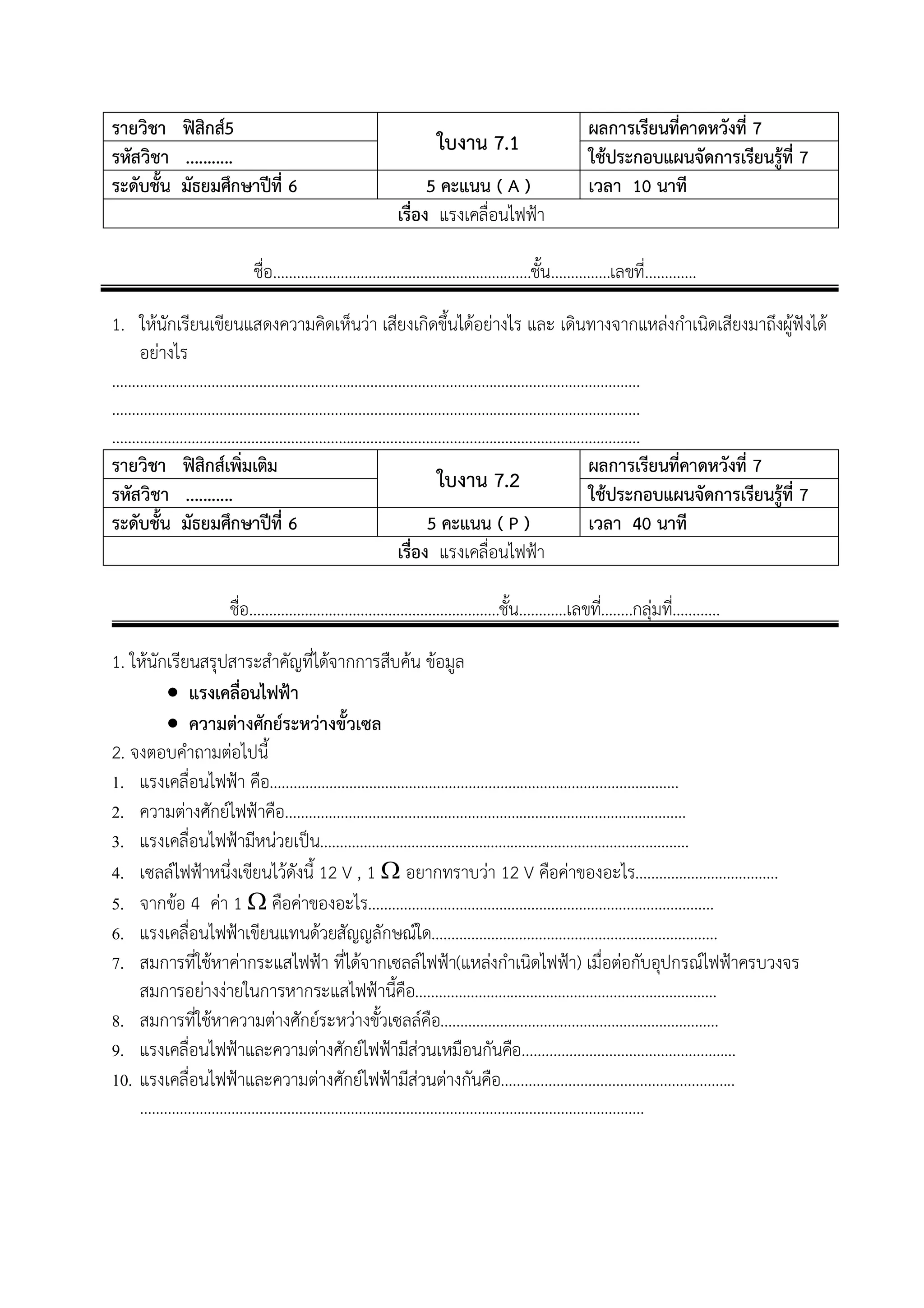 ผลการเรียนที่คาดหวังที่ 7 รหัสวิชา ........... ใบงาน 7.1 ใชประกอบแผนจัดการเรียนรูที่ 7 ระดับชั้น มัธยมศึกษาปที่ 6 5 คะแนน ( A ) เวลา 10 นาที เรื่อง แรงเคลื่อนไฟฟา ชื่อ…………………………………………………..……ชั้น……………เลขที่…………. 1. ใหนักเรียนเขียนแสดงความคิดเห็นวา เสียงเกิดขึ้นไดอยางไร และ เดินทางจากแหลงกําเนิดเสียงมาถึงผูฟงได อยางไร ……………………………………………………………………………………………………………………. ……………………………………………………………………………………………………………………. ……………………………………………………………………………………………………………………. รายวิชา ฟสิกสเพิ่มเติม ผลการเรียนที่คาดหวังที่ 7 รหัสวิชา ........... ใบงาน 7.2 ใชประกอบแผนจัดการเรียนรูที่ 7 ระดับชั้น มัธยมศึกษาปที่ 6 5 คะแนน ( P ) เวลา 40 นาที เรื่อง แรงเคลื่อนไฟฟา ชื่อ………………………………………………………ชั้น…………เลขที……..กลุมที………… ่ ่ 1. ใหนักเรียนสรุปสาระสําคัญที่ไดจากการสืบคน ขอมูล แรงเคลื่อนไฟฟา ความตางศักยระหวางขั้วเซล 2. จงตอบคําถามตอไปนี้ 1. แรงเคลื่อนไฟฟา คือ…………………………………………………………………………………………. 2. ความตางศักยไฟฟาคือ…………………………..…………………………………………………………… 3. แรงเคลื่อนไฟฟามีหนวยเปน………………………………………………………………………………… 4. เซลลไฟฟาหนึ่งเขียนไวดังนี้ 12 V , 1 อยากทราบวา 12 V คือคาของอะไร……………………………… 5. จากขอ 4 คา 1 คือคาของอะไร…………………………………………………………………………… 6. แรงเคลื่อนไฟฟาเขียนแทนดวยสัญญลักษณใด……………………………………………………………… 7. สมการที่ใชหาคากระแสไฟฟา ที่ไดจากเซลลไฟฟา(แหลงกําเนิดไฟฟา) เมื่อตอกับอุปกรณไฟฟาครบวงจร สมการอยางงายในการหากระแสไฟฟานี้คือ…………………………………………………………………. 8. สมการที่ใชหาความตางศักยระหวางขั้วเซลลคือ……………………………………………………………. 9. แรงเคลื่อนไฟฟาและความตางศักยไฟฟามีสวนเหมือนกันคือ……………………………………………… 10. แรงเคลื่อนไฟฟาและความตางศักยไฟฟามีสวนตางกันคือ………………………………………………….. ……………………………………………………………………………………………………………….