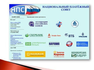 Доклад на международном деловом форуме рассматривает создание некоммерческого партнерства «национальный платежный совет» для развития электронных платежей в России. Ожидается значительный рост пользователей и объема рынка онлайн-платежей, что связано с внедрением новых технологий и законодательных инициатив. Основные игроки на рынке электронных денег, такие как qiwi и webmoney, контролируют более 90% сегмента, в то время как крупные банки планируют выход на этот рынок.