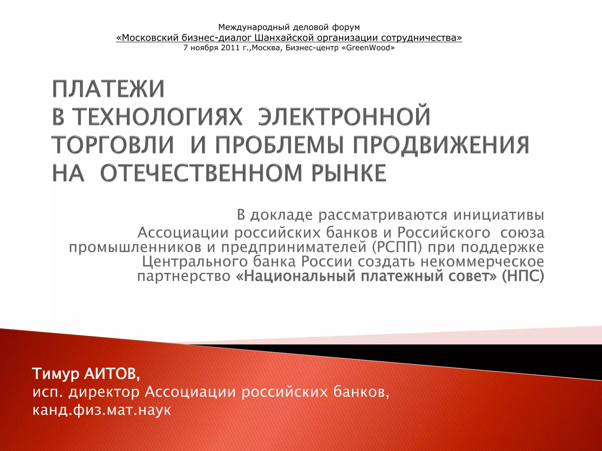Доклад на международном деловом форуме рассматривает создание некоммерческого партнерства «национальный платежный совет» для развития электронных платежей в России. Ожидается значительный рост пользователей и объема рынка онлайн-платежей, что связано с внедрением новых технологий и законодательных инициатив. Основные игроки на рынке электронных денег, такие как qiwi и webmoney, контролируют более 90% сегмента, в то время как крупные банки планируют выход на этот рынок.
