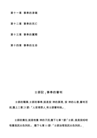 文档探讨了士师记中的事奉主题,包括事奉的性质、道路、学习、判断和配搭,强调以神的真理和心意审判百姓。士师的职责是拯救神的子民,整体内容指出事奉与神国度的关系,以及事奉中必须的团结与配搭。最终,作者提醒信徒通过属灵的判断和团体合作,增强事奉的有效性。
