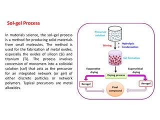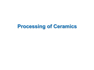 The document discusses various processing methods for ceramics, including the sol-gel process, slip casting, tape casting, extrusion, injection molding, and drying of green bodies. The sol-gel process involves the conversion of monomers into a colloidal solution that acts as a precursor for an integrated network or gel. Slip casting involves pouring a slurry into a plaster mold where the liquid is absorbed, depositing powder particles. Tape casting uses a doctor blade to spread a slurry onto a film at controlled thickness. Drying of green bodies occurs through boundary layer and pore processes, with shrinkage and defects occurring if not done uniformly.