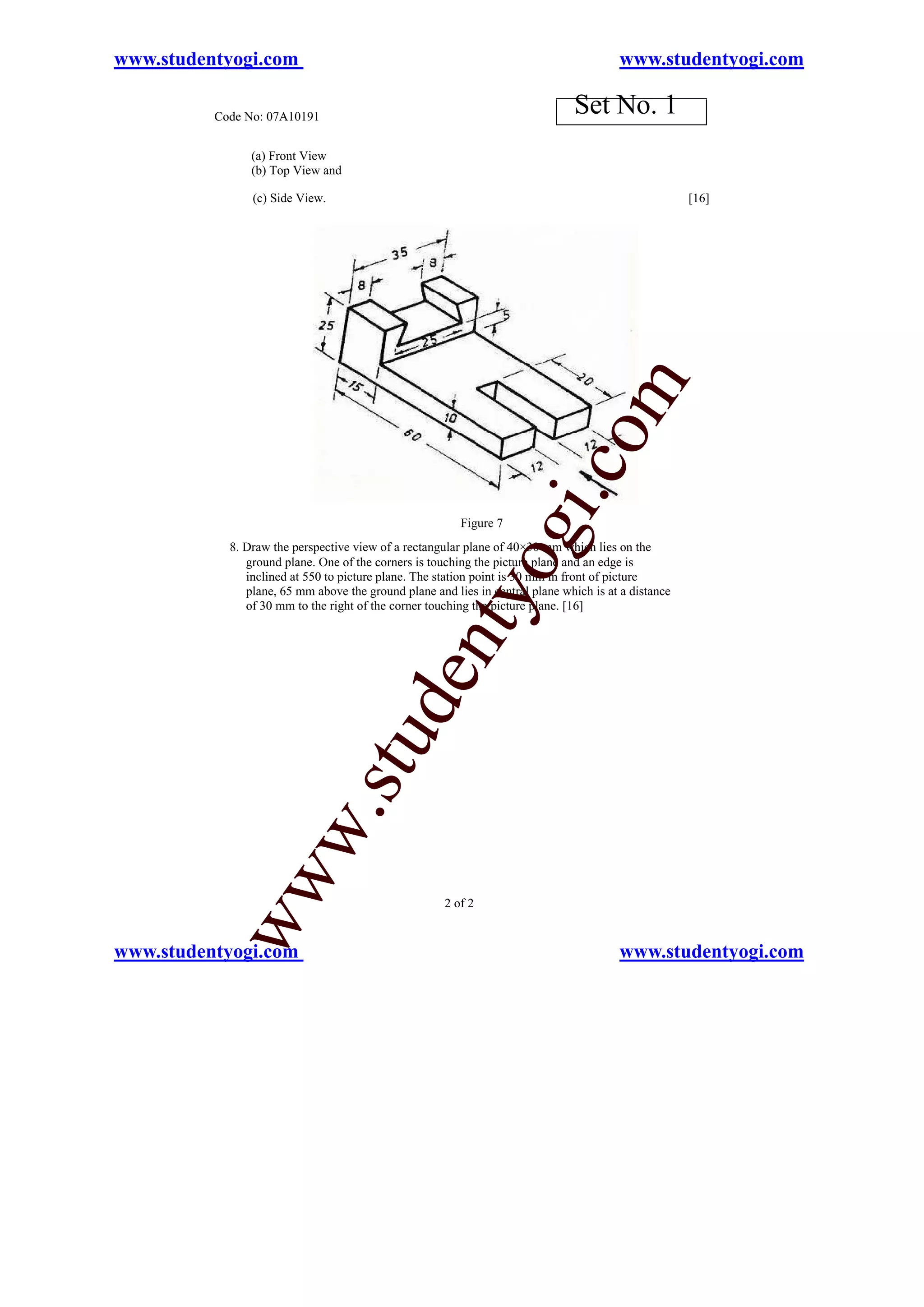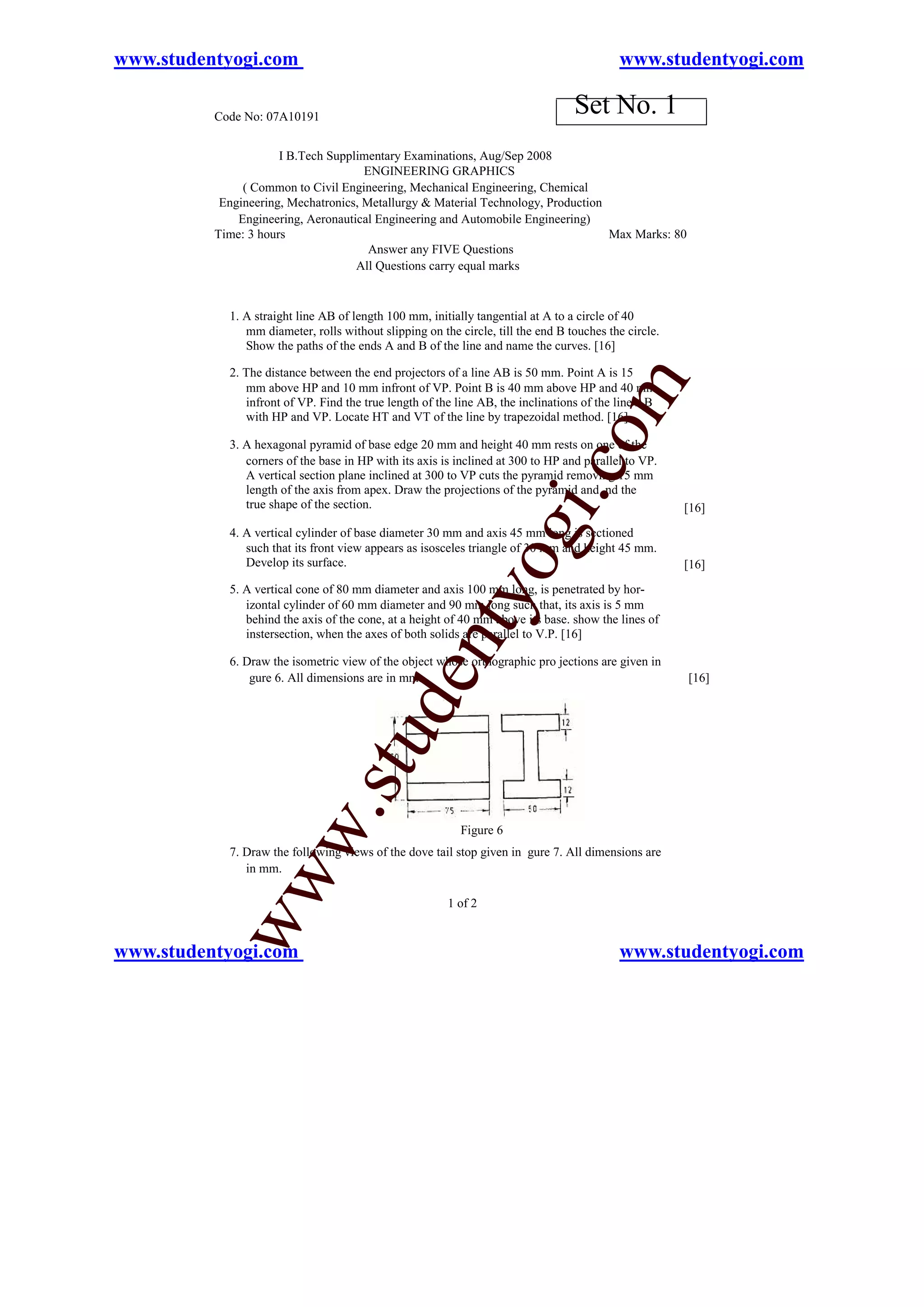 The document contains an exam for Engineering Graphics with 8 questions. It provides the questions, diagrams, and instructions for students to complete multiple choice or short answer questions related to topics in Engineering Graphics including: