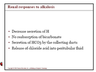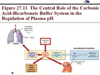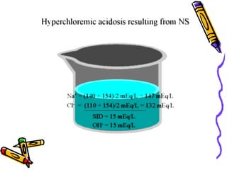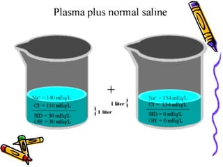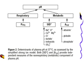 The document discusses acid-base balance and summarizes key concepts from traditional and modern physical-chemical approaches. It explains that the traditional view focused on hydrogen and bicarbonate ion concentrations, while the Stewart model emphasizes three independent variables: partial pressure of carbon dioxide, non-volatile weak acid concentration, and strong ion difference. The Stewart approach provides a more comprehensive understanding of factors influencing pH.