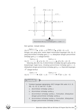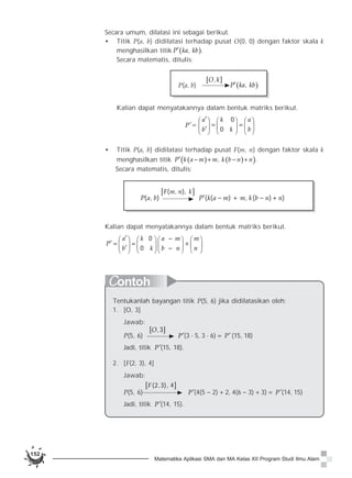 Dokumen membahas tentang konsep transformasi geometri, termasuk pantograf sebagai alat untuk mendilatasi gambar, serta berbagai jenis transformasi seperti translasi, refleksi, rotasi, dan dilatasi. Contoh-contoh nyata dari translasi ditunjukkan melalui perpindahan tempat duduk dalam kelas dan transformasi pada titik-titik dalam koordinat Cartesius. Materi ini mengajak pembaca untuk memahami dan menerapkan prinsip-prinsip transformasi pada objek geometris.