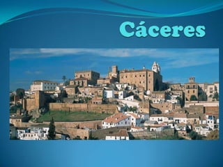 The document summarizes several sights in Cáceres, Spain. The main square was originally an esplanade used for markets and fairs, and later became the social center. The Santa María Church was built between the 15th-16th centuries in a Romanesque style over a 13th century structure. The San Mateo Church is Gothic and was constructed over the remains of a mosque. The Bishop Palace has the oldest sections from the 13th century while the main facade is from the 16th century, and exhibits Renaissance and Gothic styles.