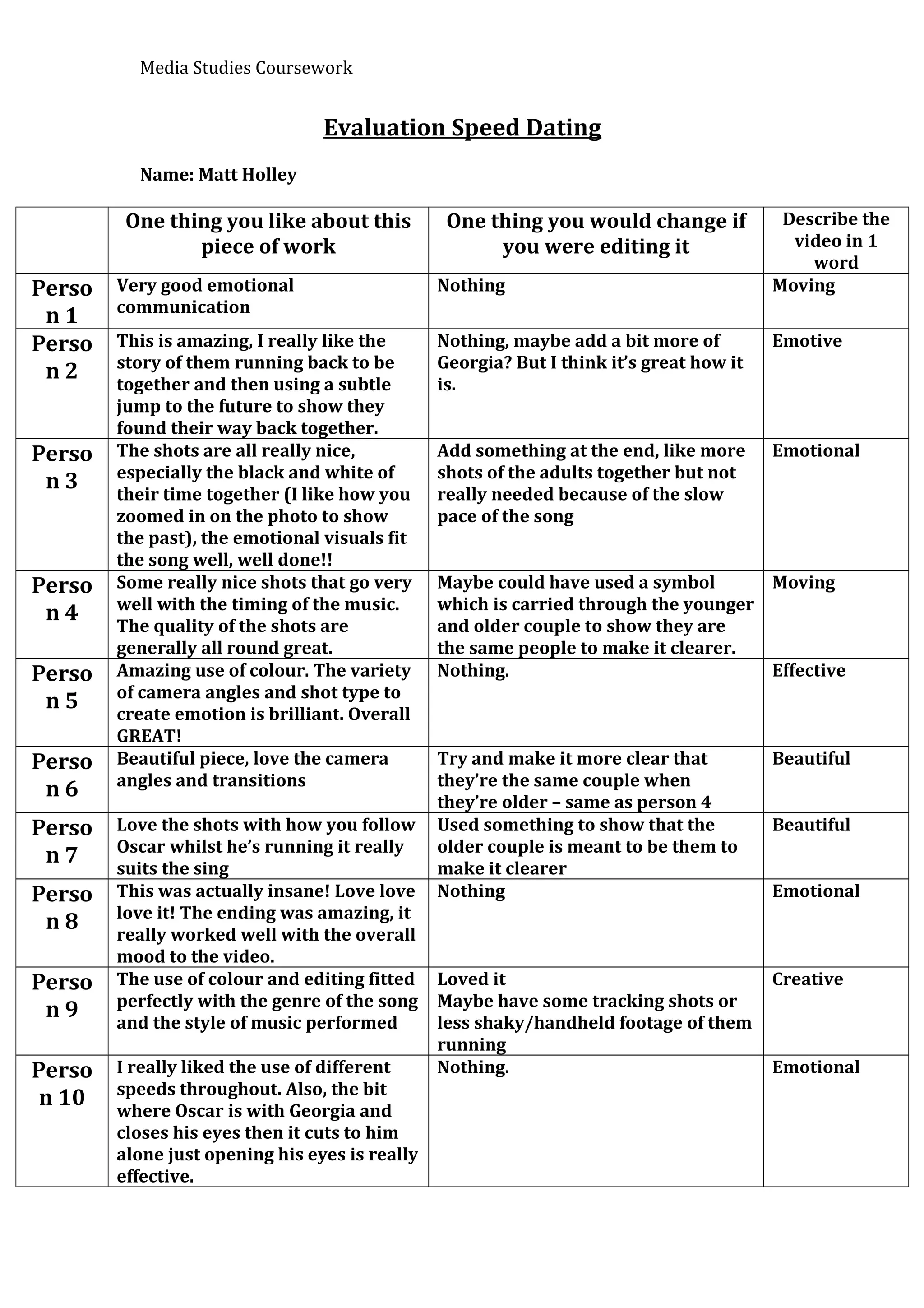 This document contains feedback from 15 people on a media studies coursework video. The feedback included things people liked about the video, such as the emotional storytelling, effective camera angles and shots, and how well the visuals fit the song. Suggested changes were minor, with a few people noting it could be made clearer that the older couple were the same people as the younger ones. Overall, the feedback was very positive, with the video widely praised for its emotional impact, creative use of techniques like color and editing, and ability to tell a story through visuals and pace.