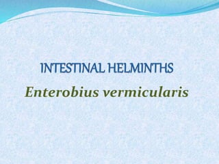 This document discusses Enterobius vermicularis (the pinworm). It begins by listing learning objectives about the parasite's geographical distribution, morphology, life cycle, diseases caused, and diagnosis. It then covers the parasite's history, morphology, life cycle, transmission as eggs via contaminated hands, symptoms of pruritus, and diagnosis via microscopic identification of eggs in feces or perianal scrapings. Treatment involves pyrantel pamoate or mebendazole. Prevention focuses on hygiene like handwashing and changing undergarments.