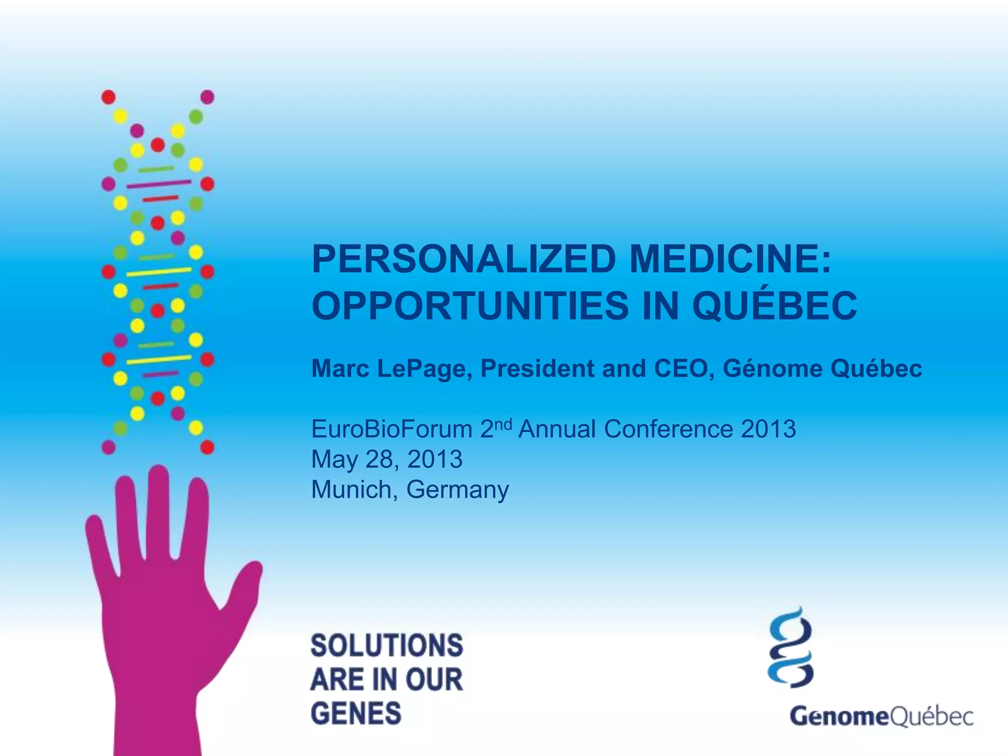 The document discusses the advancements and opportunities in personalized medicine through the initiatives of Génome Québec, which has invested $750 million in over 80 genomics projects since its establishment in 2000. It highlights various technologies used, includes a description of their innovation center at McGill University, and details multiple ongoing personalized medicine projects with substantial budgets aimed at different health issues. The goals outlined emphasize fostering international collaborations and developing successful translational strategies in clinical genomics.