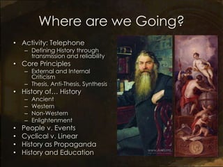 This document outlines the agenda and activities for a Theory of Knowledge class focusing on historical method. It includes an activity where students verbally relay an account of an event to demonstrate how details can be lost or altered over transmission. The document then covers core principles of history, different approaches to history through time in various cultures, and potential patterns and uses of history. It poses discussion questions about the nature of history, objectivity, and the relationship between history and other areas of knowledge.