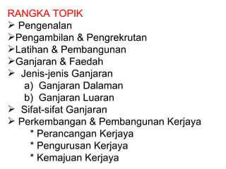 Dokumen tersebut membahas mengenai pengurusan sumber daya manusia, termasuk rekrutmen, pelatihan, penilaian kinerja, kompensasi, pengembangan karir, dan hubungan industrial. Topik-topik utama mencakup analisis pekerjaan, proses rekrutmen, pelatihan berkelanjutan, penilaian kinerja berbasis sasaran, jenis insentif, dan perkembangan tahapan karir seseorang.