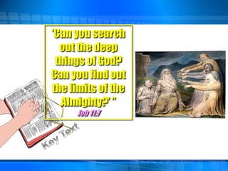 Job's friends Bildad and Zophar argued that Job must have sinned and was receiving retributive punishment from God. However, they were wrong because while the Bible documents times God enacted retributive punishment, it also shows His mercy. God saved people like Noah and Lot from widespread judgment. Job's friends lacked compassion for Job's suffering and wrongly assumed they knew the reason for his trials better than God. The document examines examples of divine judgment from the Bible to argue that while real, retributive punishment was not what Job was experiencing, and his friends should not have been such harsh comforters.