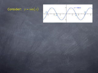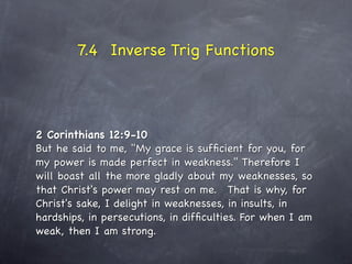 This document discusses inverse trigonometric functions including arcsine, arccosine, and arctangent. It explains that arcsine is the inverse of sine, with domain [-1,1] and range [-π/2, π/2]. Arccosine has domain [-1,1] and range [0,π]. Arctangent has domain (-∞, ∞) and range [-π/2, π/2]. The document also notes that applying the inverse function twice returns the original value, and the outer function's domain takes precedence when functions are composed. It recommends graphing the inverse trig functions to better understand their properties.
