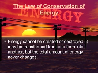 The document discusses the Law of Conservation of Energy. It states that energy cannot be created or destroyed, but can be transformed from one form to another. Energy exists in several forms including potential, kinetic, chemical, thermal, electromagnetic, electrical, and nuclear. However, the total quantity of energy remains constant as it transforms between forms.
