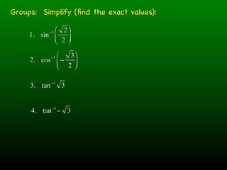 The document discusses inverse trigonometric functions and working through examples of evaluating inverse trig expressions. It begins with simplifying inverse trig expressions to find their exact values. Students then work through examples together, showing the step-by-step work to solve inverse trig functions involving multiple nested inverse trig functions. Examples involve finding angles, determining quadrant ranges, and addressing issues like multiple wraparounds. The document emphasizes conceptual understanding over rote calculation.