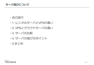 Page/2 サーバ選びについて ・⾃⼰紹介 ・1. レンタルサーバとVPSの違い ・2. VPSとクラウドサーバの違い ・3.