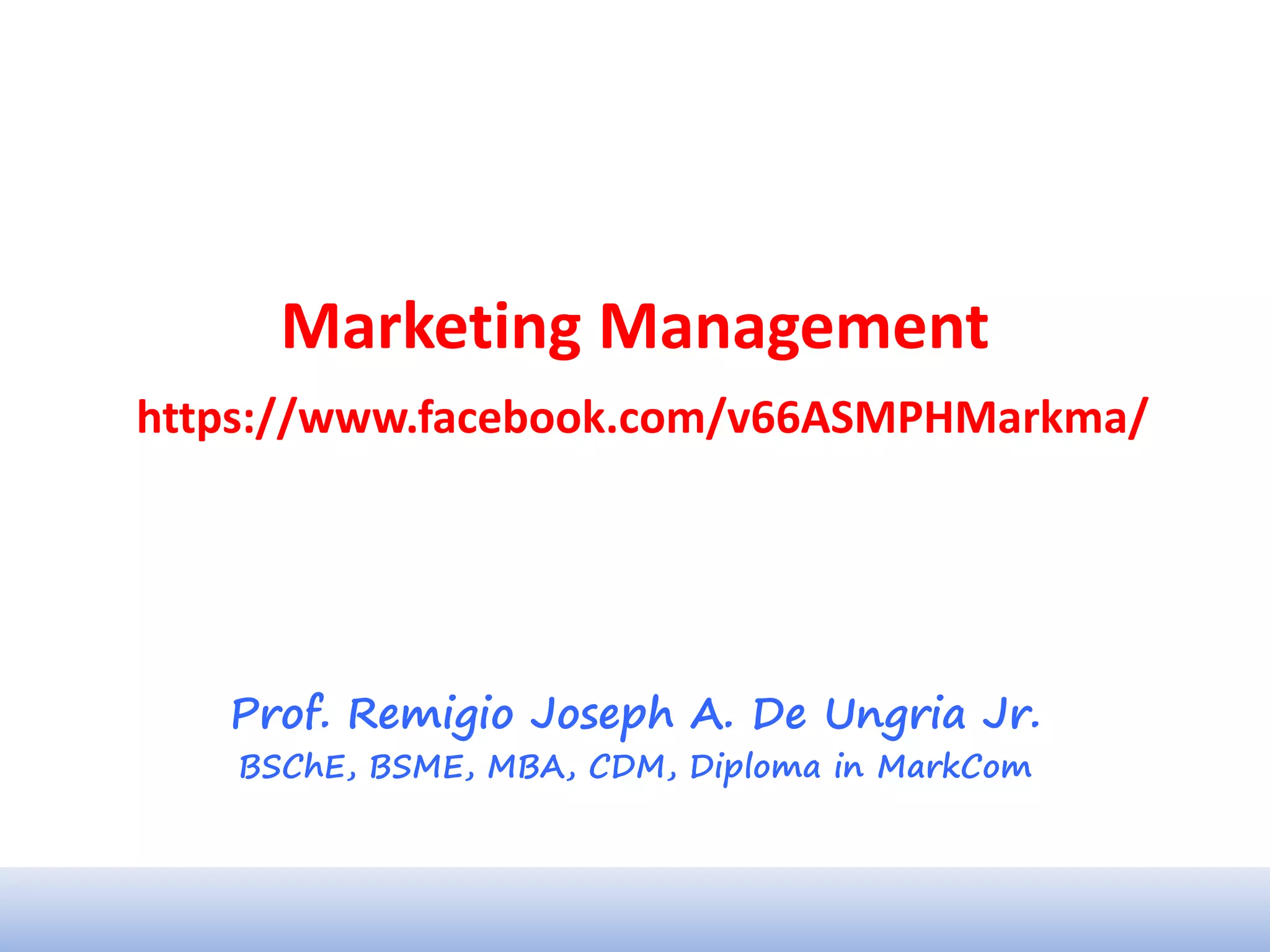 This document outlines the plan for an introductory marketing management class. It discusses (1) forming permanent working groups of 5 students each to work together throughout the course, (2) the importance of communication for establishing the class's baseline knowledge of marketing, and (3) applying basic marketing research concepts by having students research the demographics, connections, behaviors and psychographics of their classmates. The goal is to create an administrative system to help the class and apply marketing fundamentals.