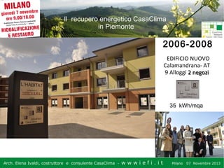 Il documento discute il recupero energetico delle costruzioni secondo il protocollo CasaClima in Piemonte, con particolare attenzione a vari progetti realizzati tra il 2006 e il 2013. Analizza i consumi energetici, le migliorie apportate e i costi associati a diversi edifici, confrontando i dati pre e post recupero. Le informazioni sono accompagnate da statistiche dettagliate sui consumi, evidenziando i risultati positivi e le sfide incontrate durante il processo di riqualificazione energetica.