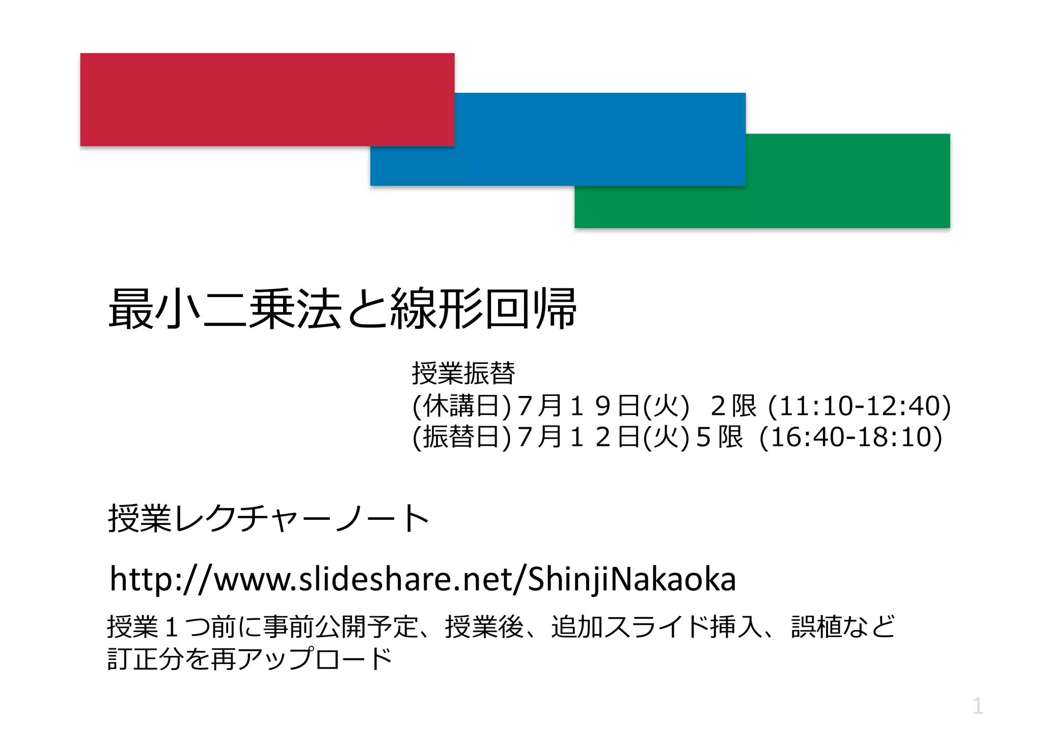 最⼩⼆乗法と線形回帰 1 授業振替 (休講⽇)7⽉19⽇(⽕) 2限 (11:10-12:40) (振替⽇)7⽉12⽇(⽕)5限