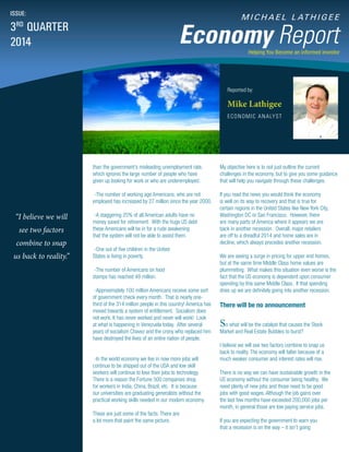 The document is a newsletter discussing the state of the US economy from the perspective of an economic analyst, Mike Lathigee. It summarizes that while official reports claim the economy is recovering, the reality is that inequality is growing as the rich get richer and the middle class and poor get poorer. Unemployment and other key economic indicators show most Americans are worse off than during the 2008 recession. It recommends investors increase their holdings of physical gold and silver to 10% of their portfolio as a hedge against potential economic troubles in the future.