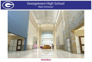 This floor plan shows the layout of Georgetown High School, which includes areas for academics, athletics, fine arts, administration, a cafeteria, auditorium, computer labs, science labs, and special education. The plan also labels the student commons, main entrance, and cafetorium.