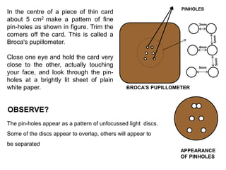 The document describes an experiment using a Broca's pupillometer to demonstrate the dilation and constriction responses of pupils in reaction to light. By observing blurred images through pinholes while covering one eye, it shows that the iris of one eye responds to the light entering the other eye, indicating a connection between their responses. Paul Broca's background in studying the relationship between brain regions and specific functions is also mentioned.