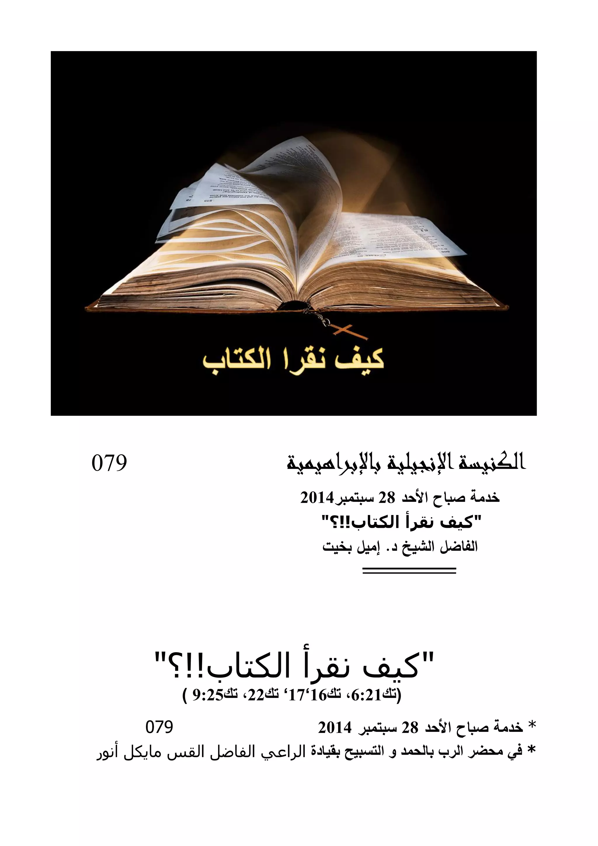 تحت عنوان "الكتاب!!؟ نقرأ كيف"، تناول الشيخ الفاضل بخيت إميل أهمية قراءة الكتاب المقدس وكيف يمكن أن تؤثر هذه القراءة على حياتنا الروحية. أكد أن الإقبال على قراءة الكتاب هو ضروري لاستيعاب رسائل الله والتقرب منه، محذراً من الخسارة التي قد نتعرض لها إذا أهملنا ذلك. الأهمية تكمن في الفهم الذاتي للمعاني وأثرها في حياتنا بشكل عام.