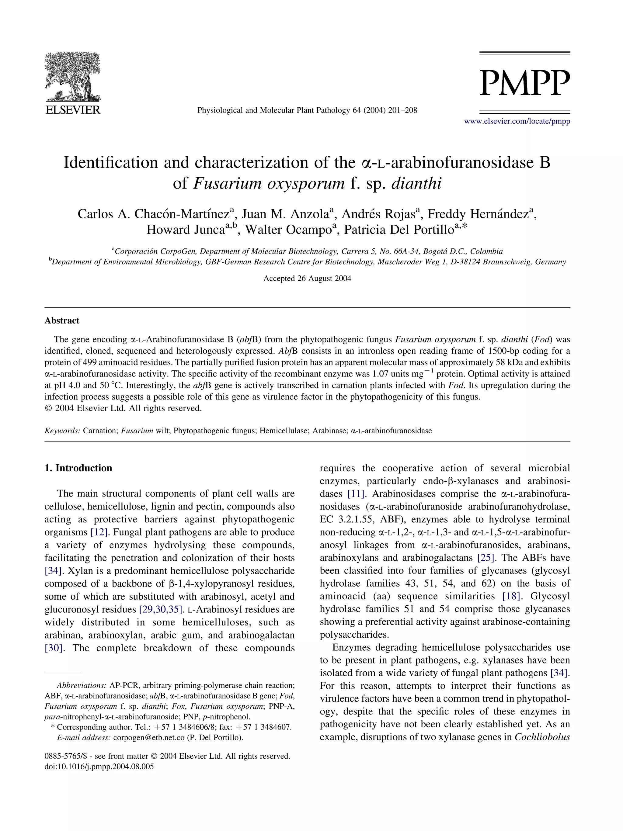The document describes the identification, cloning, sequencing, and characterization of the a-L-arabinofuranosidase B (abfB) gene from the phytopathogenic fungus Fusarium oxysporum f. sp. dianthi (Fod). The gene was identified using random amplified polymorphic DNA and encodes a protein of 499 amino acids. The recombinant protein expressed in E. coli had arabinofuranosidase activity and optimal activity at pH 4.0 and 50°C. Reverse transcription PCR showed that the abfB gene is actively transcribed in carnation plants infected with Fod, suggesting it plays a role in the fungus's pathogenicity.