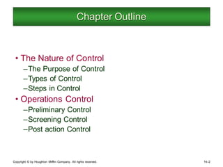 This chapter discusses the concept of control in management. It defines control as regulating organizational activities to keep performance within acceptable limits. The chapter outlines the purpose of control, different types of control (operations, financial, structural, strategic), and the steps in the control process (establish standards, measure performance, compare to standards, determine need for corrective action). It also discusses tools for financial control like budgets and financial statements, as well as challenges in implementing effective control systems and overcoming resistance to control.