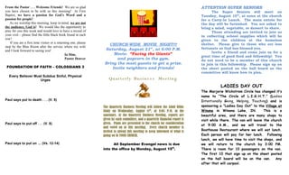 This document provides information about upcoming events at the First Baptist Church located in Valparaiso, Indiana. It announces that the IGNITE youth ministry will resume on Wednesdays in September. It also lists the church's weekly schedule including visitation on Tuesdays, prayer and bible study on Wednesdays, ladies and men's bible studies, and financial information. The document provides details about worship services, children's church, and notes from the pastor welcoming visitors.