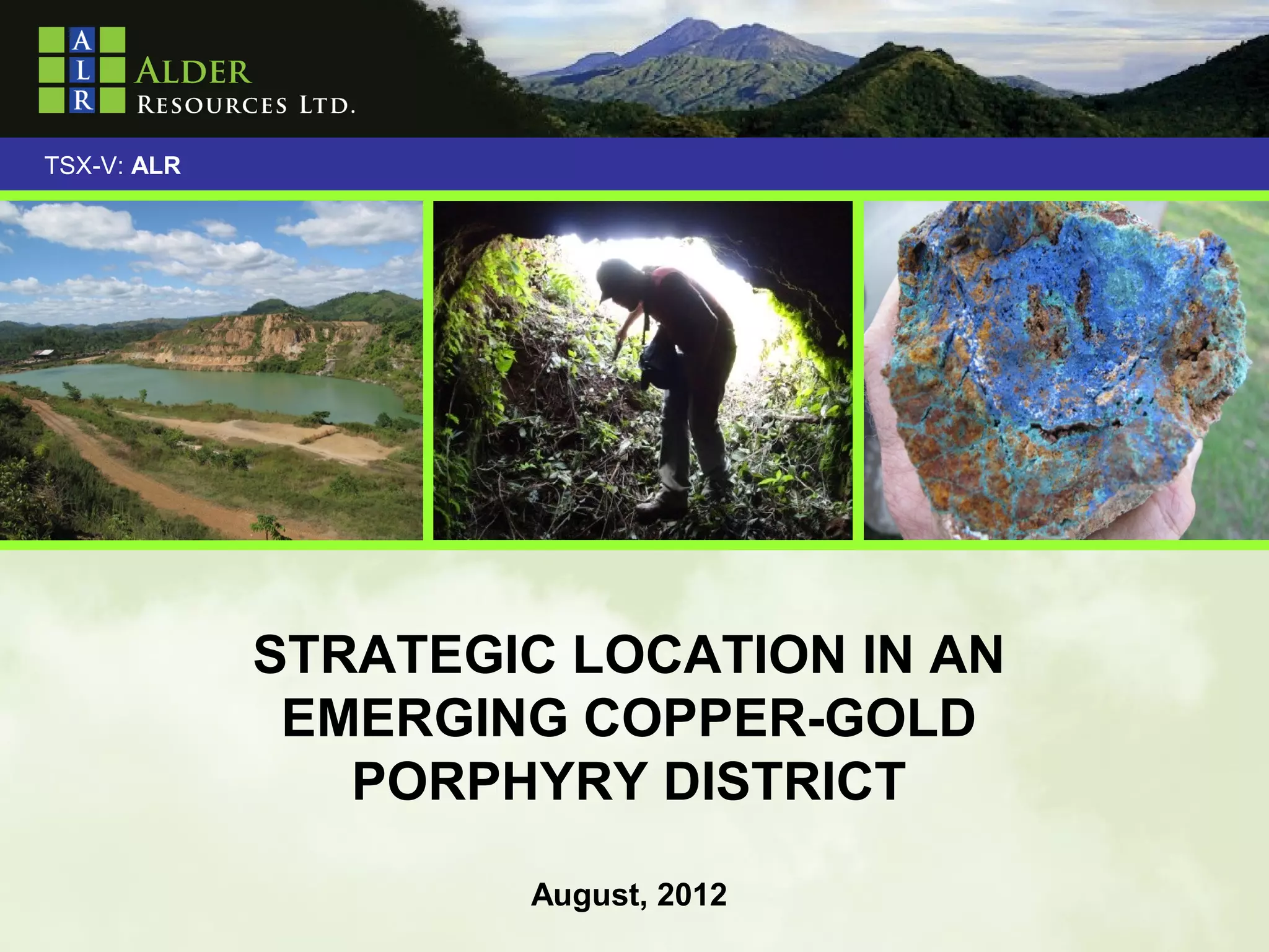 Alder Resources holds a 65% interest in the 33 km2 Rosita copper-gold-silver property in northeast Nicaragua. Rosita is located in an emerging porphyry district and was a past producer. Alder's experienced management team recently outlined an initial inferred resource at Rosita of 108 million pounds of copper, 118 thousand ounces of gold, and 2.4 million ounces of silver. Alder's objectives are to discover large porphyry deposits at Rosita, expand resources around past open pits, expand its land portfolio, and practice diligent cash management.