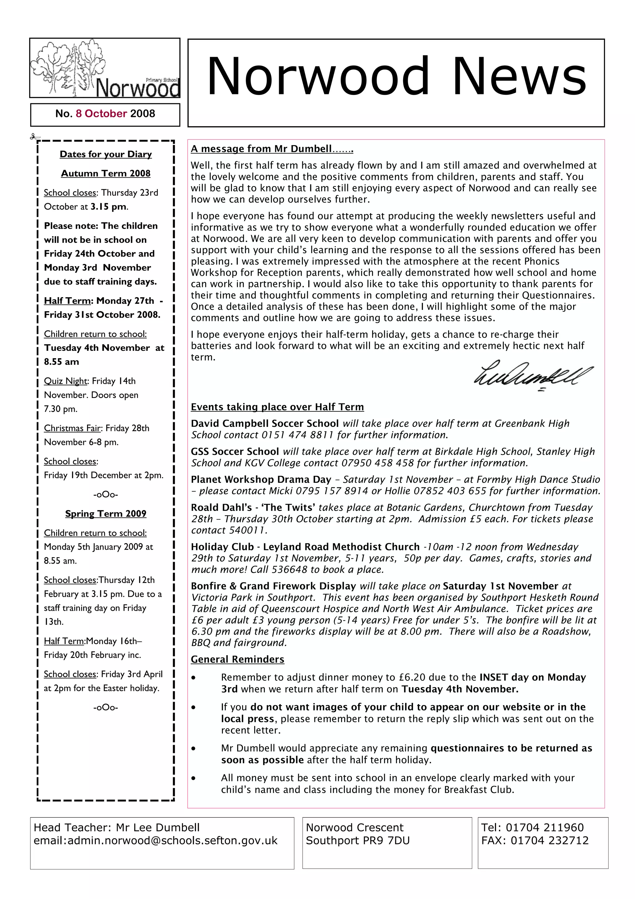 - The head teacher, Mr. Dumbell, is enjoying his new role at Norwood and sees opportunities to further develop the school.