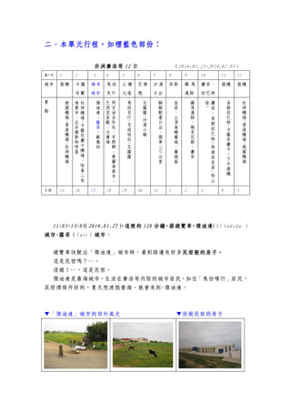 文档描述了一次为期12天的摩洛哥旅行行程,涵盖了城市间的交通、景点游览和餐饮安排。具体行程包括参观卡萨布兰卡、傑迪達、薩菲和蘇維拉等地,体验当地特色午餐与海岸风光。旅行中还提到对摩洛哥农业和港口业的了解,以及美丽风景的印象。