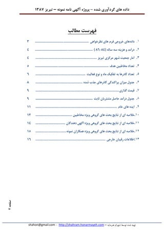 داده–پروژهآگهینامهنمونه–تبریز7831 هنرمایه شهرام توسط شده تهیه–http://shahram.honarmayeh.com-shahon@gmail.com صفحه2 مطالب فهرست 1.دادهنظرخواهی های فرم خروجی های....................................................................8 2.( ساله سه هزینه و درآمد38-38).........................................................................8 3.تبریز مرکزی شهر جمعیت آمار................................................................8 4.مخاطبین تعدادهدف.............................................................................................5 5.فعالیت نوع و ماه تفکیک به کادرها تعداد....................................................8 6.شده جذب کادرهای پراکندگی میزان جدول.................................................3 7.گذاری قیمت.......................................................................................9 8.ثابت مشتریان حاصل درآمد جدول.....................................................................9 9.خام های ایده.....................................................................................77 01.از ای خالصهمخاطبین ویژه گروهی های بحث نتایج......................................72 00.دهندگان آگهی ویژه گروهی های بحث نتایج از ای خالصه...............................78 02.همکاران ویژه گروهی های بحث نتایج از ای خالصهنمونه................................75 03.خارجی رقیبان اطالعات.........................................................................78